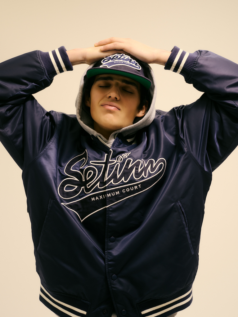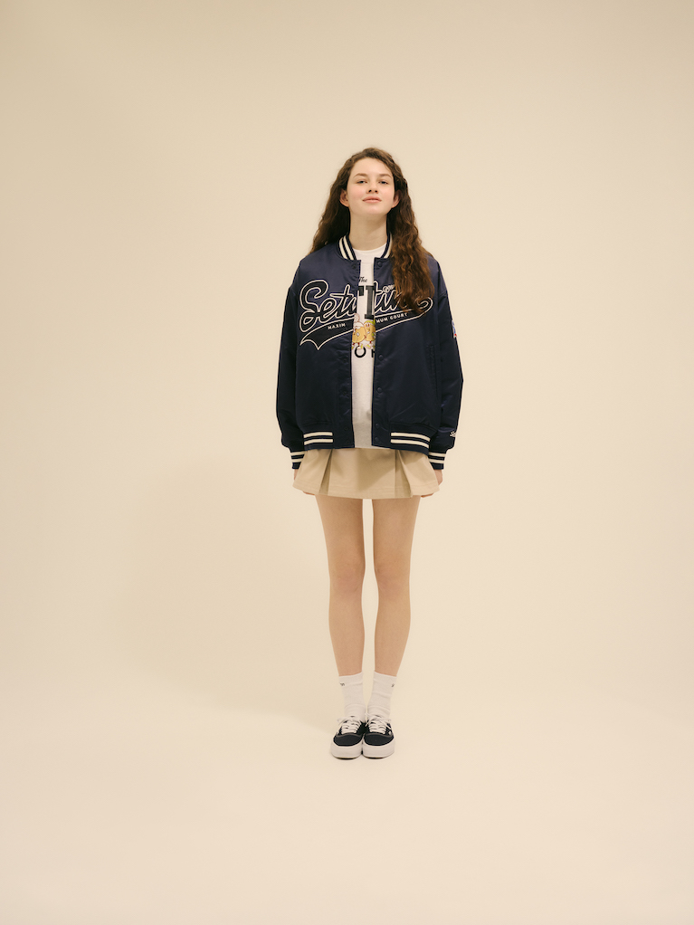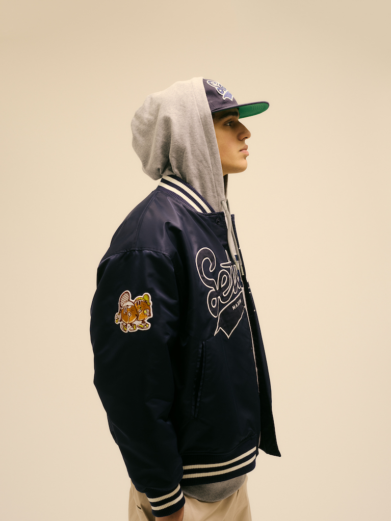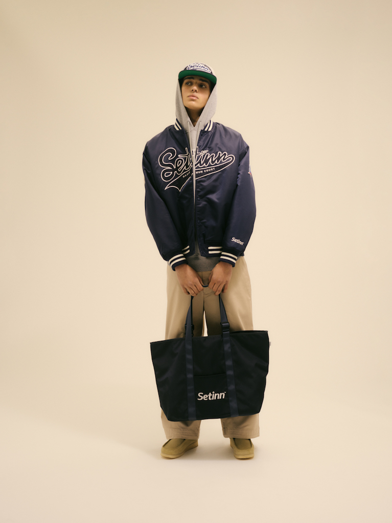 Stadium Cap ¥8,250 / Stadium Jumper ¥38,500 / College Logo Hoodie ¥20,900 / Stretch Classic Chino Pants ¥24,200 / Setinn Gym Tote ¥12,100